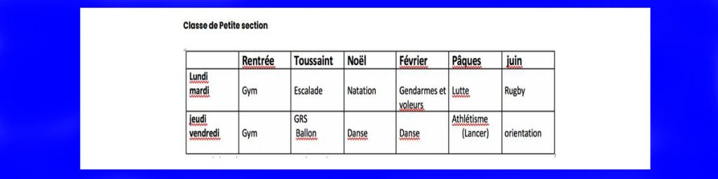 Une programmation d’école permet d’assurer une diversité d’APSA tout en assurant une stabilisation des apprentissages. Elle permet aussi un travail d’équipe sur une même période (projets communs, mise en place commune du matériel).